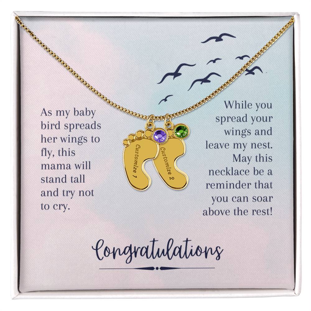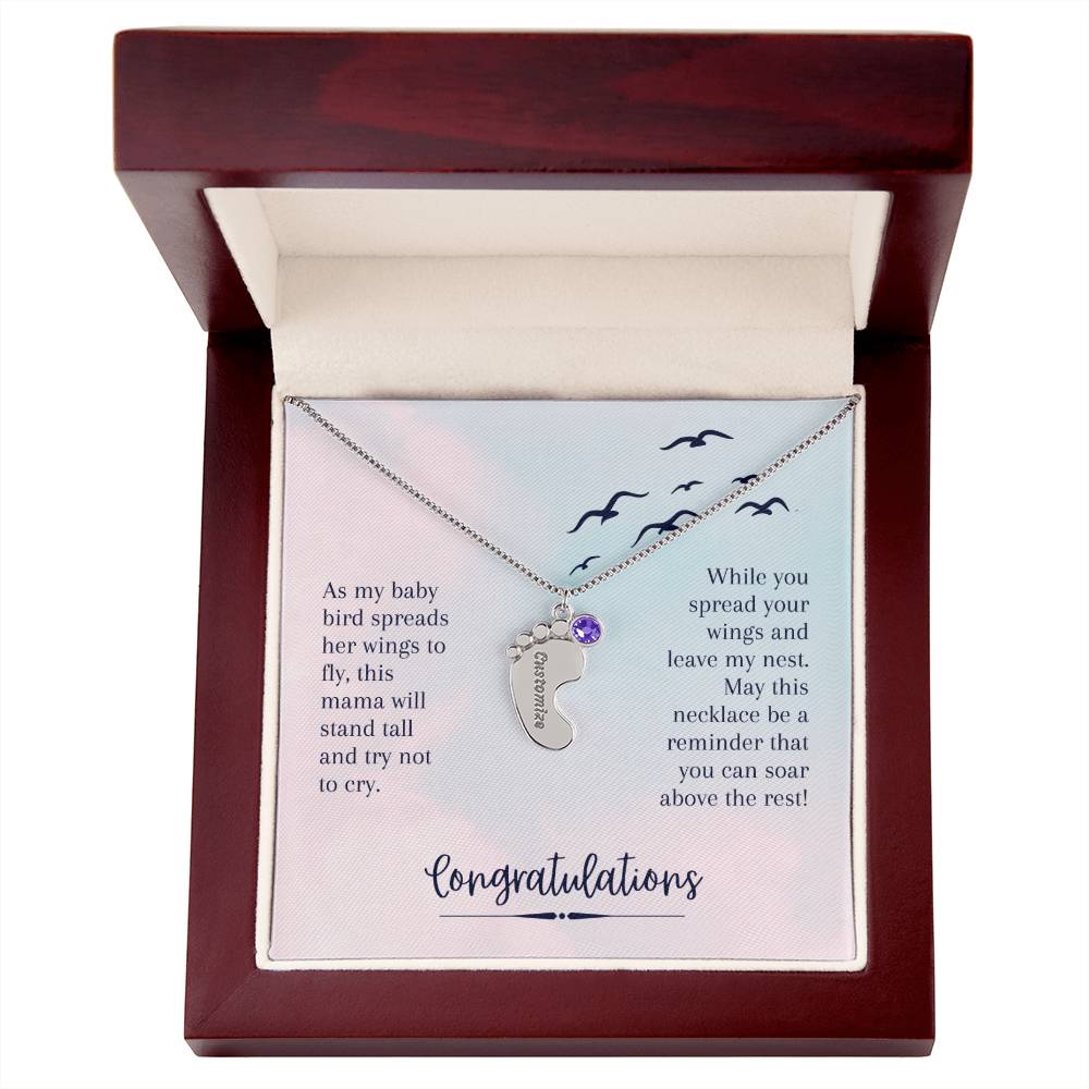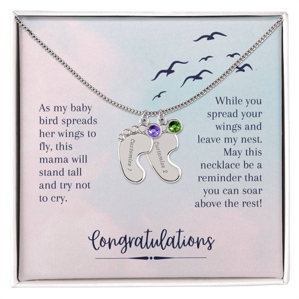 Celebrate the arrival of a newborn or cherish a precious memory with our Custom Baby Feet Necklace with Birthstone. Personalize your gift by engraving a name of your choice onto the pendant and choosing a crystal that correlates with the baby's birth month. And by picking multiple pendants, a custom present like this is perfect for moms and grandmothers with big families. This is a one-of-a-kind keepsake that will be treasured for a lifetime!