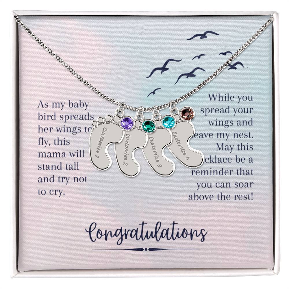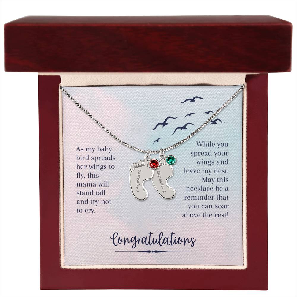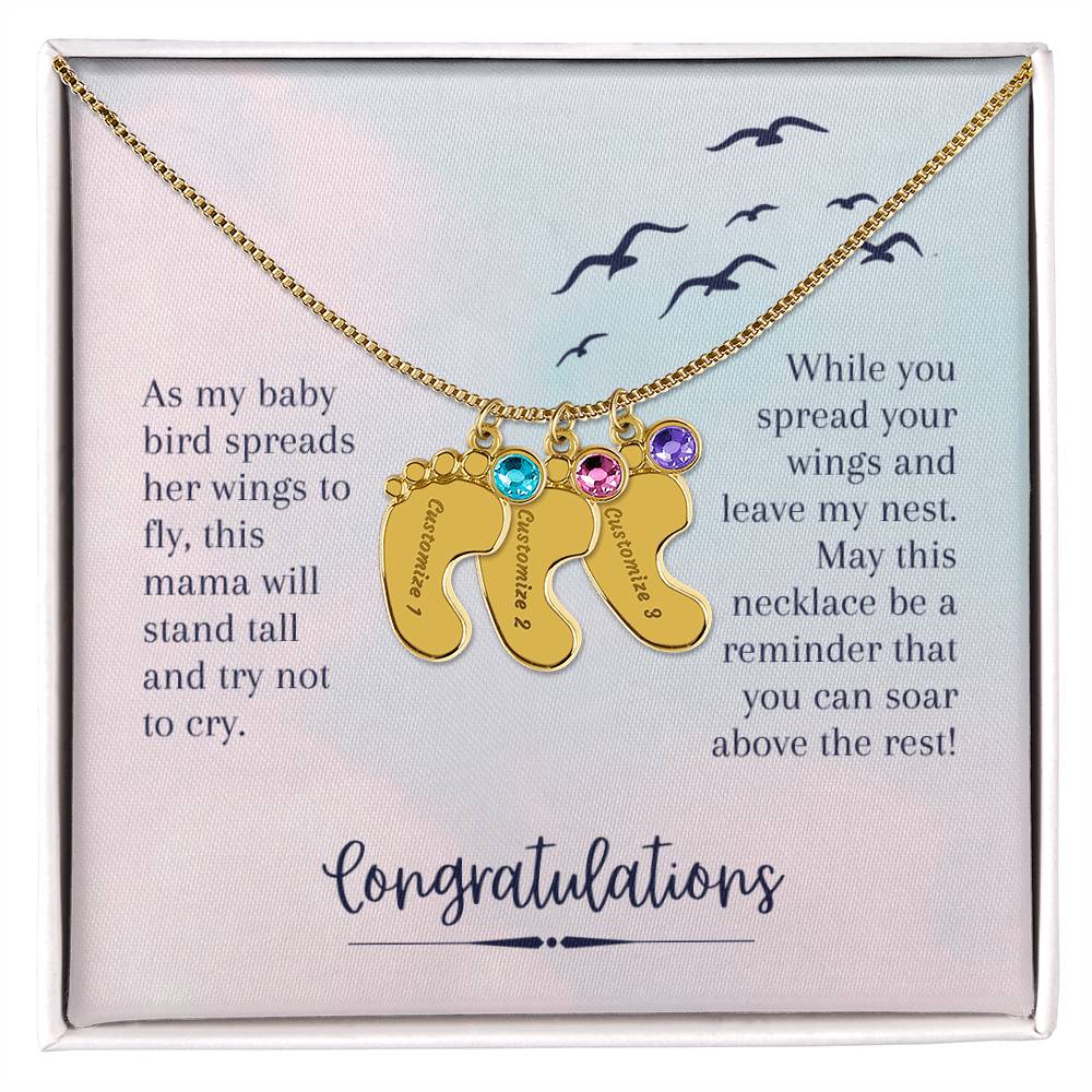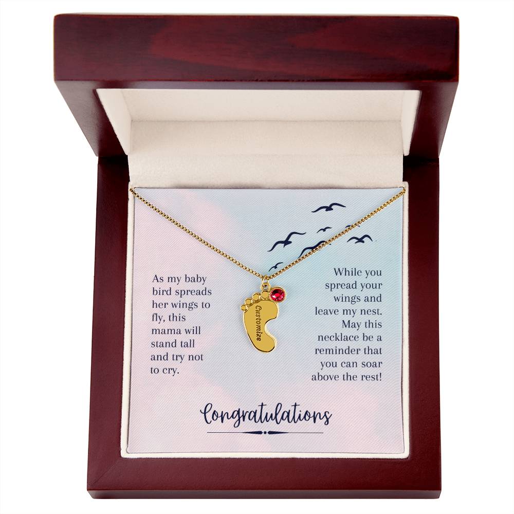 Celebrate the arrival of a newborn or cherish a precious memory with our Custom Baby Feet Necklace with Birthstone. Personalize your gift by engraving a name of your choice onto the pendant and choosing a crystal that correlates with the baby's birth month. And by picking multiple pendants, a custom present like this is perfect for moms and grandmothers with big families. This is a one-of-a-kind keepsake that will be treasured for a lifetime!