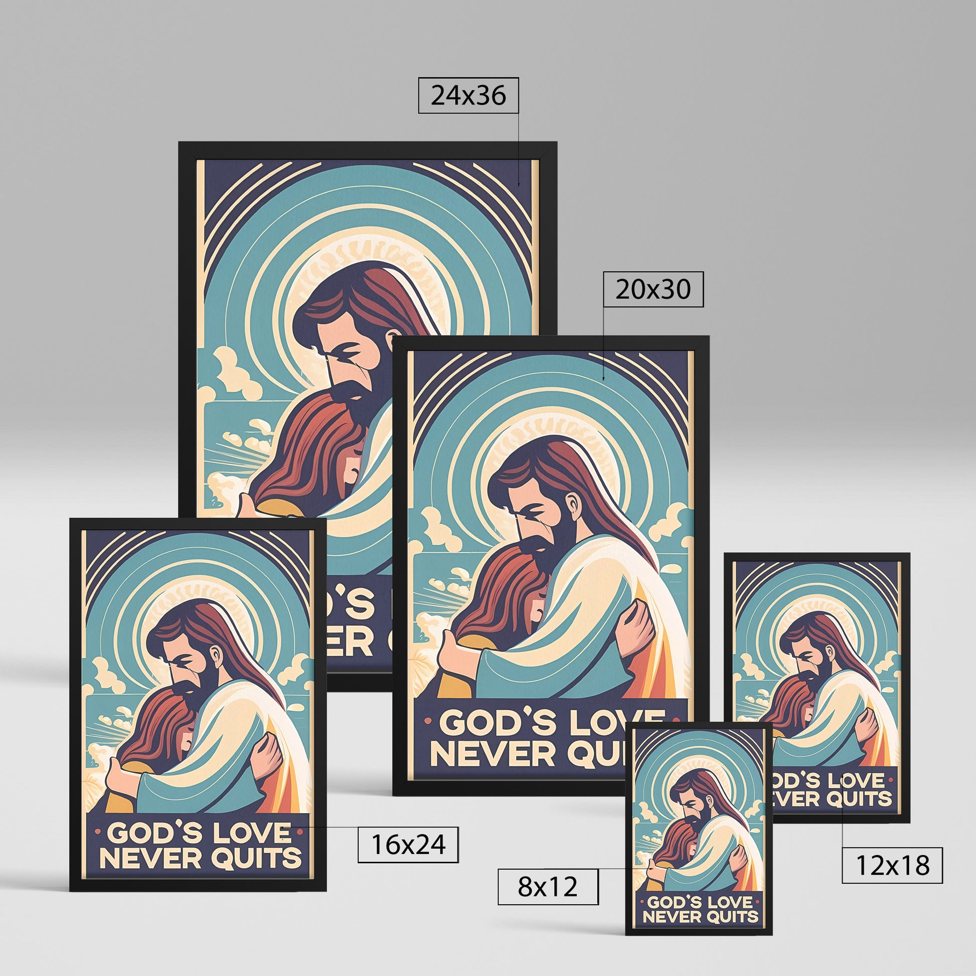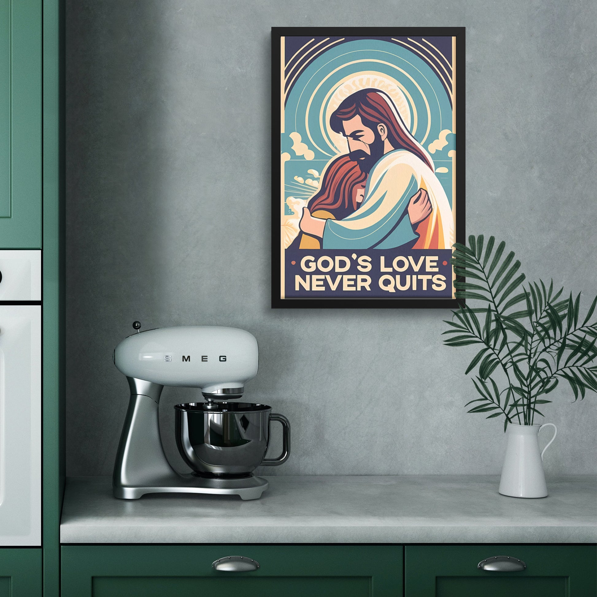 This framed poster captures the essence of retro charm while delivering a message of profound comfort and the touching imagery of a girl receiving a warm embrace from Jesus. It evokes the timeless assurance that in moments of need, God's love is ever-present. The words, "God's Love Never Quits," are elegantly and lovingly displayed, inviting you to take solace in the unfailing love of the Divine.
