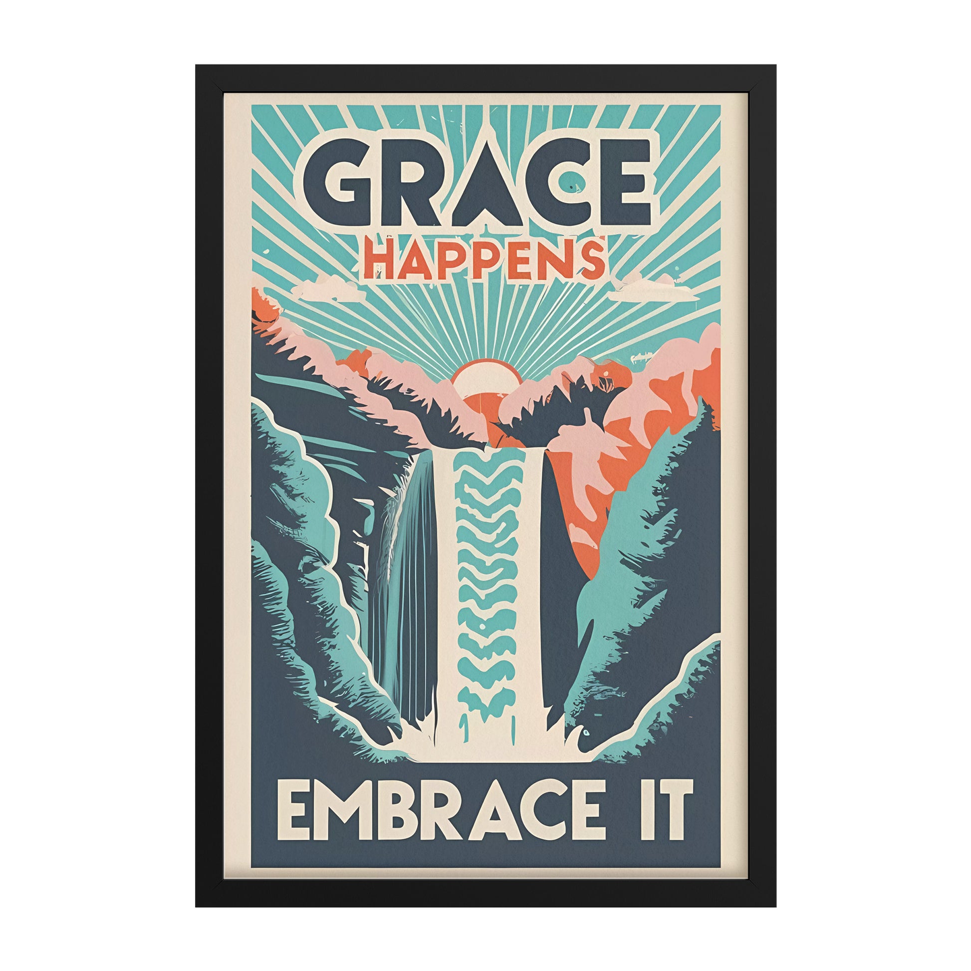 This framed poster captures the essence of retro charm while delivering a message of profound serenity and the captivating imagery of a sunrise and waterfall, symbolizing the awe-inspiring beauty of life's grace-filled moments. It invites you to embrace the unfolding grace that surrounds you. The words, "Grace Happens, Embrace It," are elegantly and lovingly displayed, inviting you to cherish life's divine surprises.