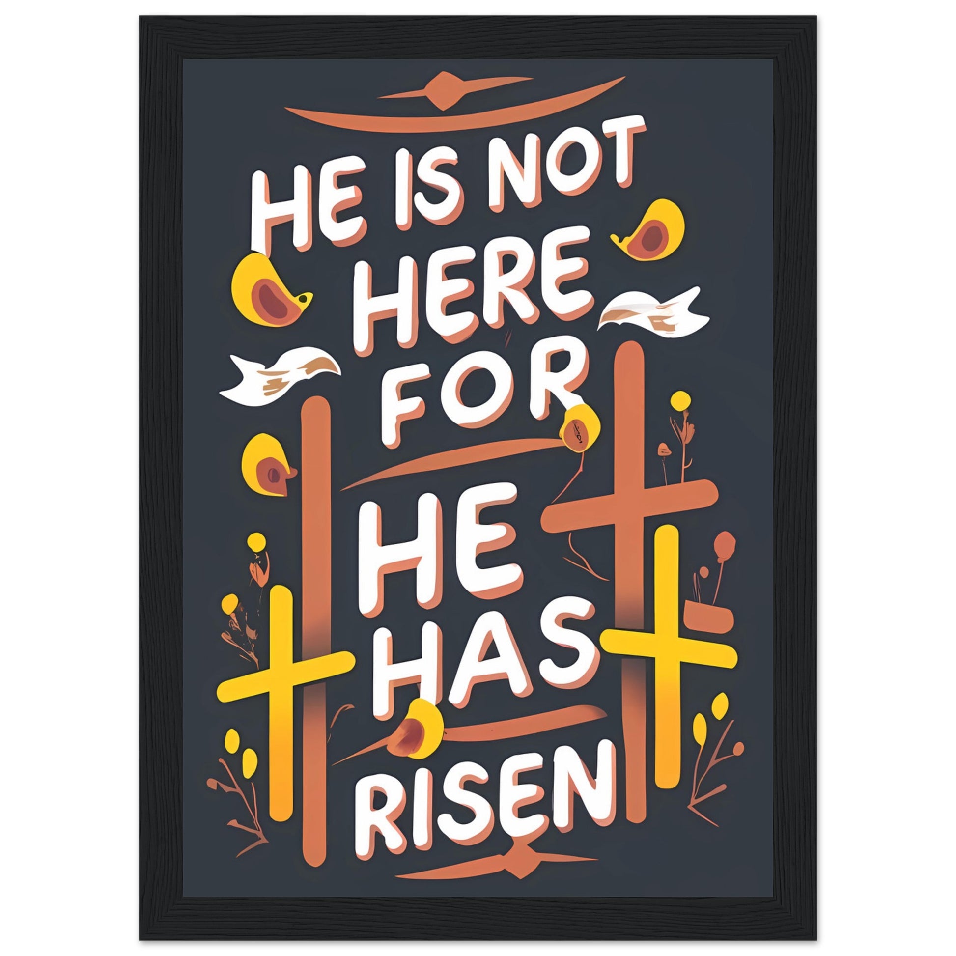 This framed typography poster captures the essence of reverence and awe while delivering a message of profound faith. It features the words, "He Is Not Here, For He Has Risen," displayed with artistic typography, emphasizing the momentous truth of Jesus' resurrection. It invites you to reflect on the transformative power of this event and the hope it brings to believers worldwide.