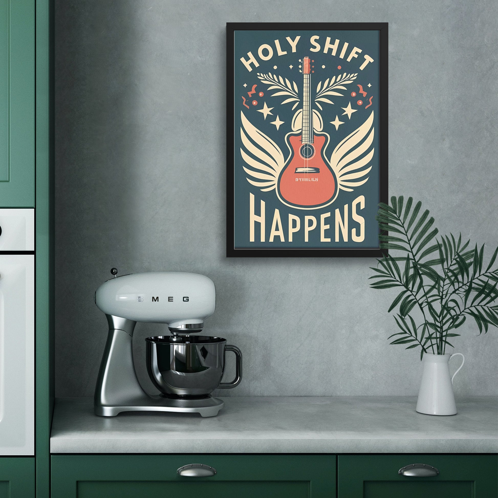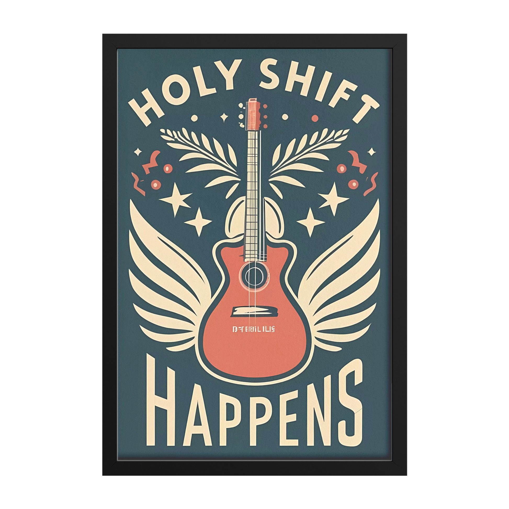 This framed poster captures the essence of retro charm while delivering a message of spiritual transformation and the enchanting imagery of a guitar with wings, symbolizing the power of faith. The words, "Holy Shift Happens," are creatively and lovingly displayed, inviting you to embrace the transformative potential of your faith journey.