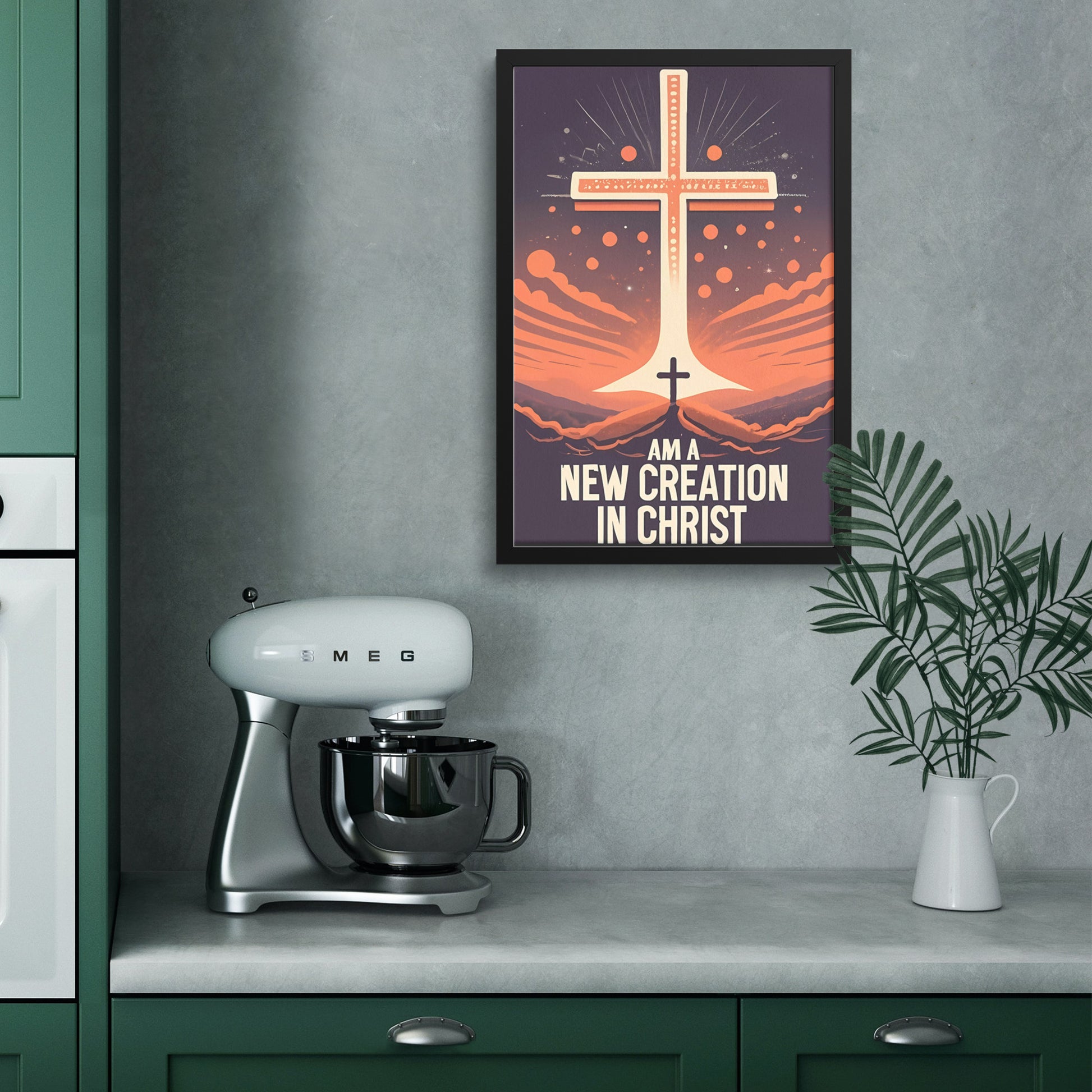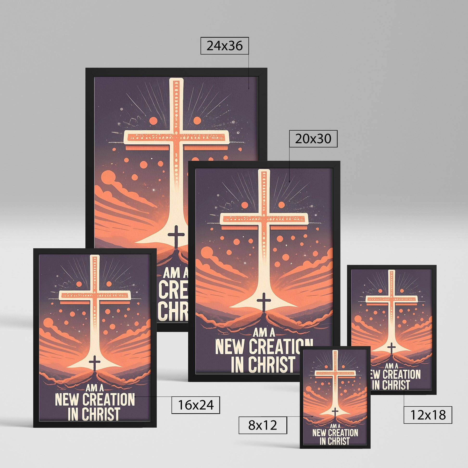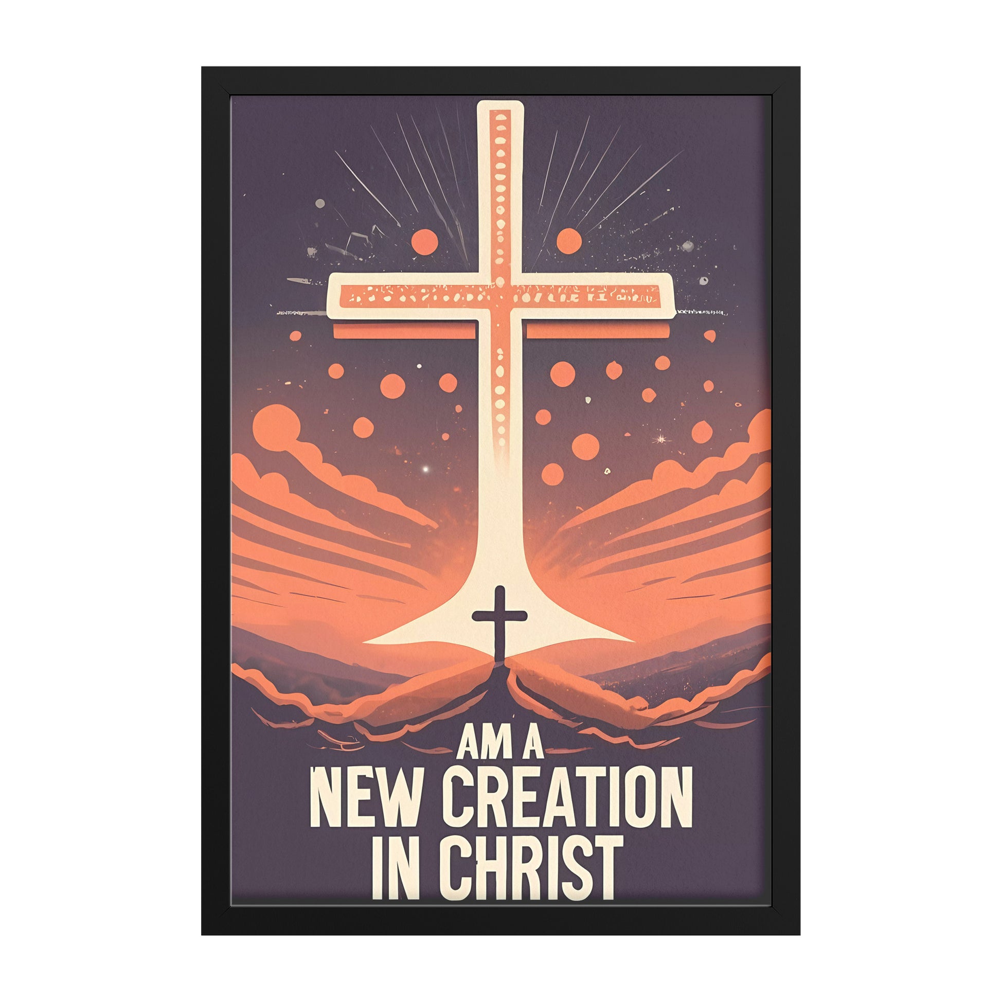 This framed poster features a retro-inspired design that exudes nostalgia and empowerment. Against a backdrop of a radiant dawn, symbolizing new beginnings and hope, a small cross stands boldly before a giant, glowing cross. The empowering slogan "I am a new creation in Christ" is elegantly displayed in a classic font.