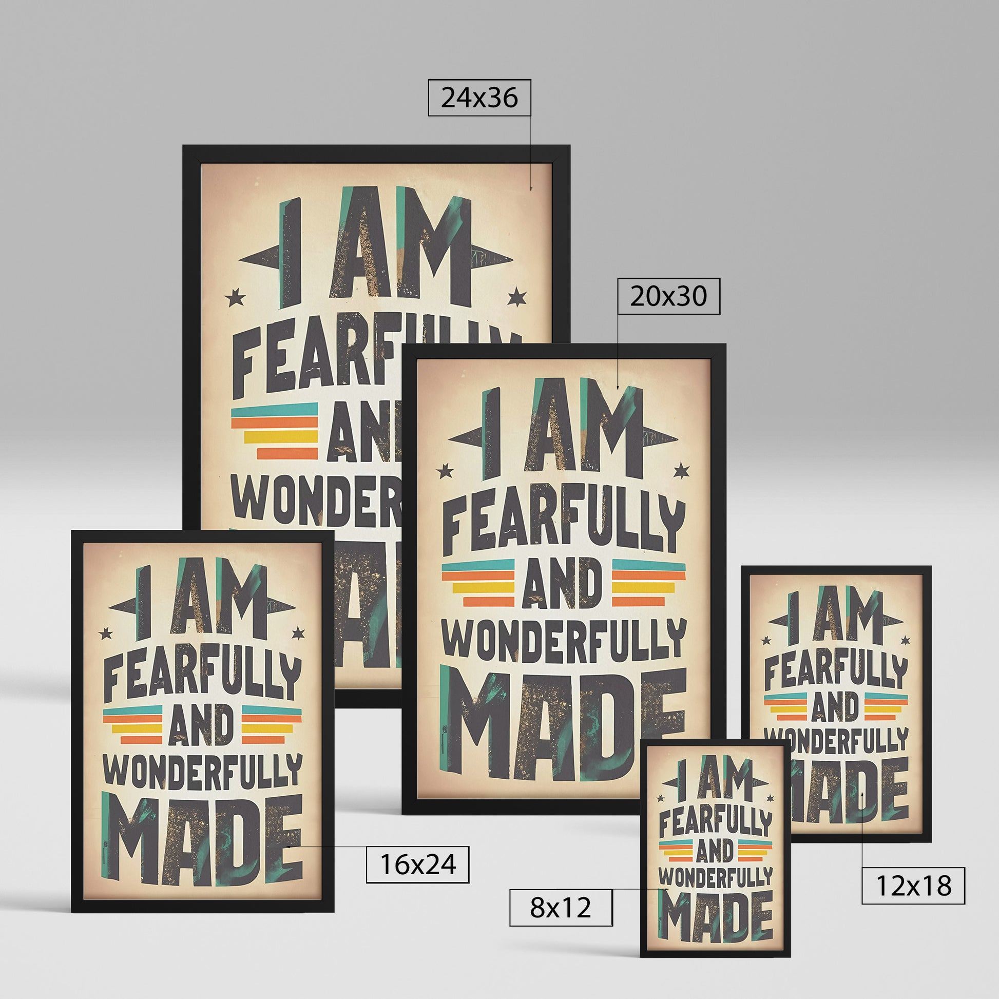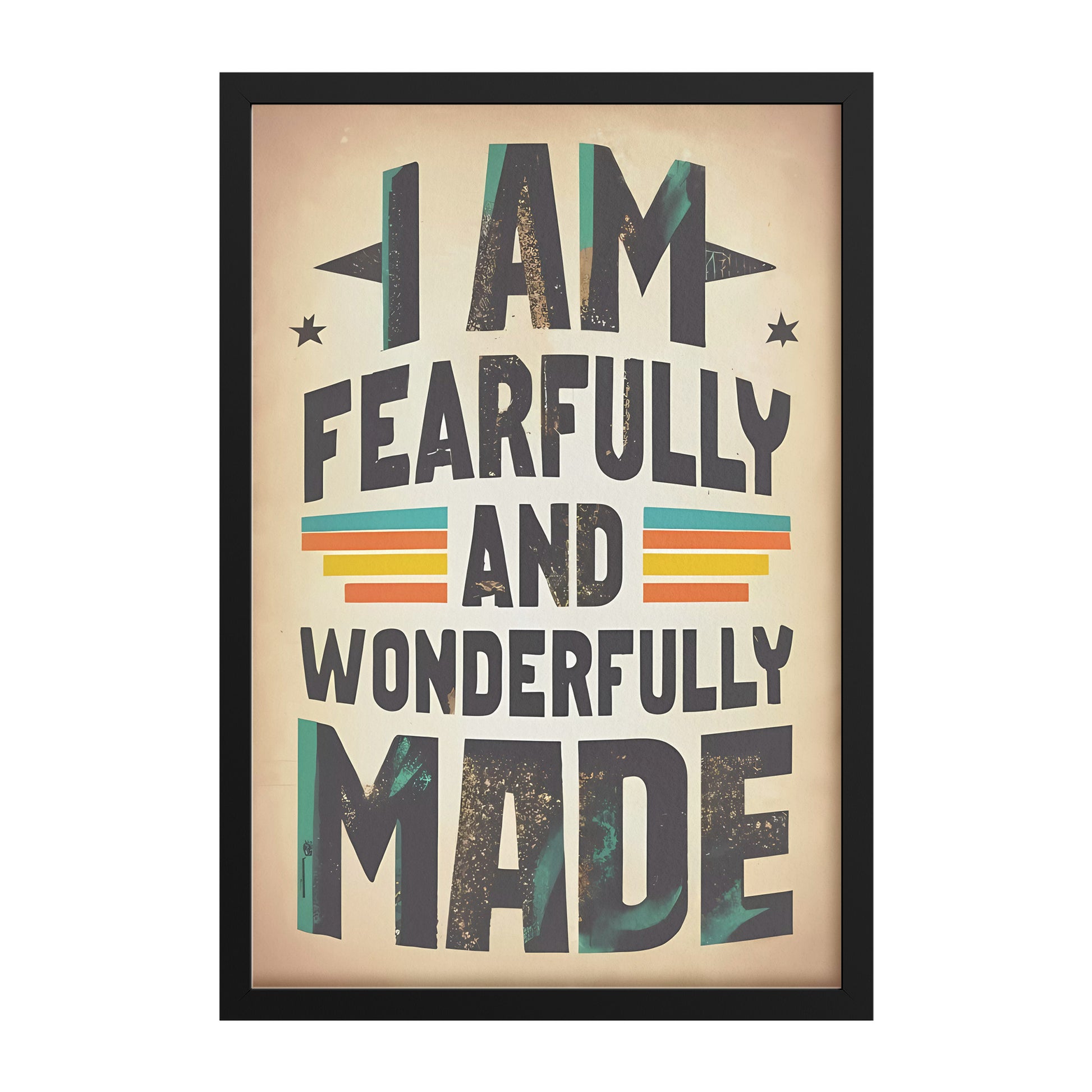 This framed poster features a retro-inspired design that exudes nostalgia and empowerment. The inspiring slogan "I am fearfully and wonderfully made" is elegantly displayed in a classic font, emphasizing the significance of recognizing your intrinsic value and unique beauty.