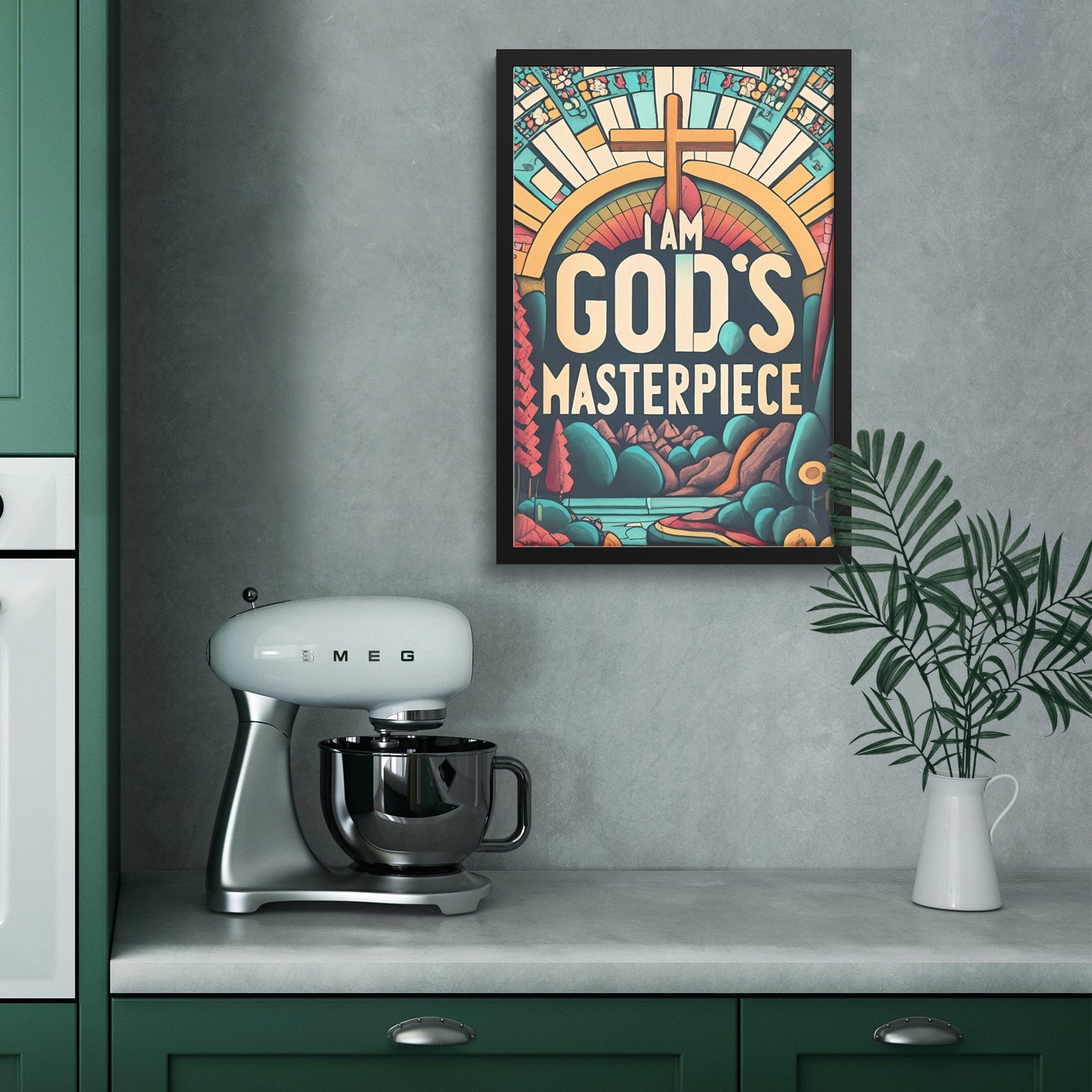 This framed poster features a retro-inspired design that exudes nostalgia and empowerment. Against a backdrop of a serene forest and a reflective pond, a cross stands as a symbol of the divine presence. The empowering slogan "I am God's Masterpiece" is elegantly displayed in a classic font, emphasizing the significance of recognizing your unique purpose and value.