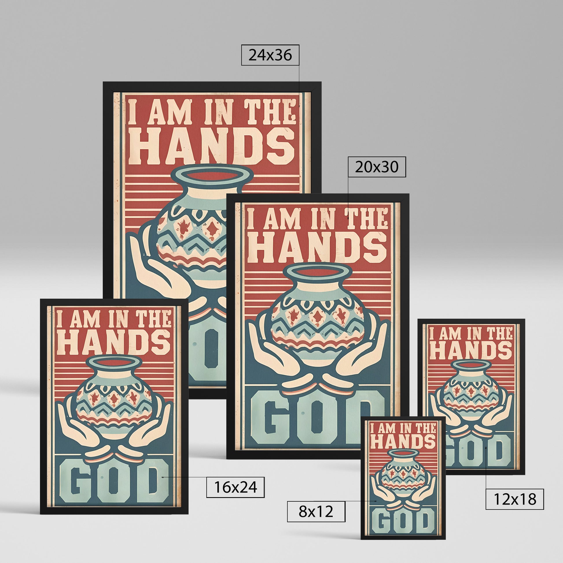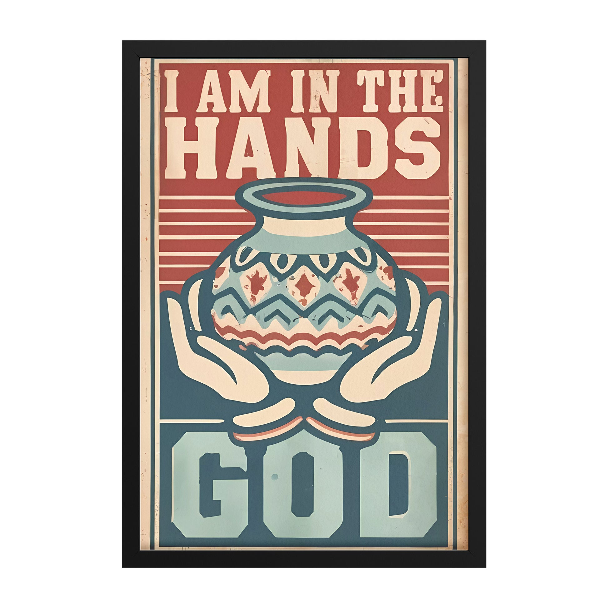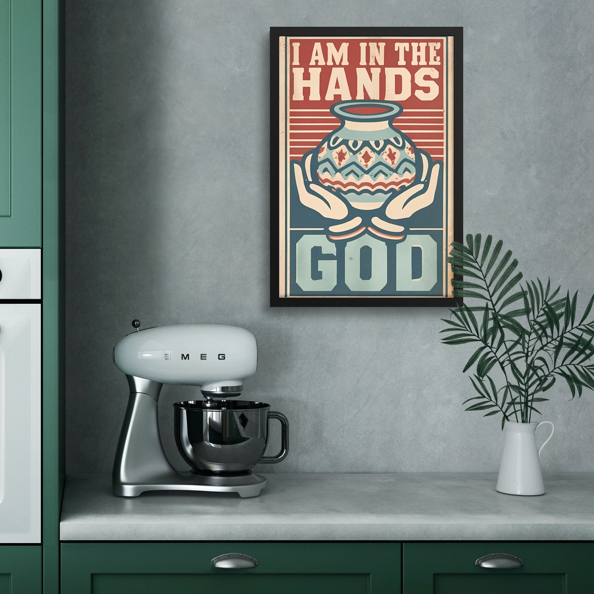 This framed poster, inspired by a retro aesthetic, invokes the gentle nostalgia of yesteryears while exuding timeless wisdom. At the center of the design, a delicate pottery piece, molded from the clay of existence, rests in the loving embrace of the Creator's hands. The powerful affirmation, "I am in the hands of God," is elegantly scripted, inviting you to surrender to the divine providence that shapes your journey.