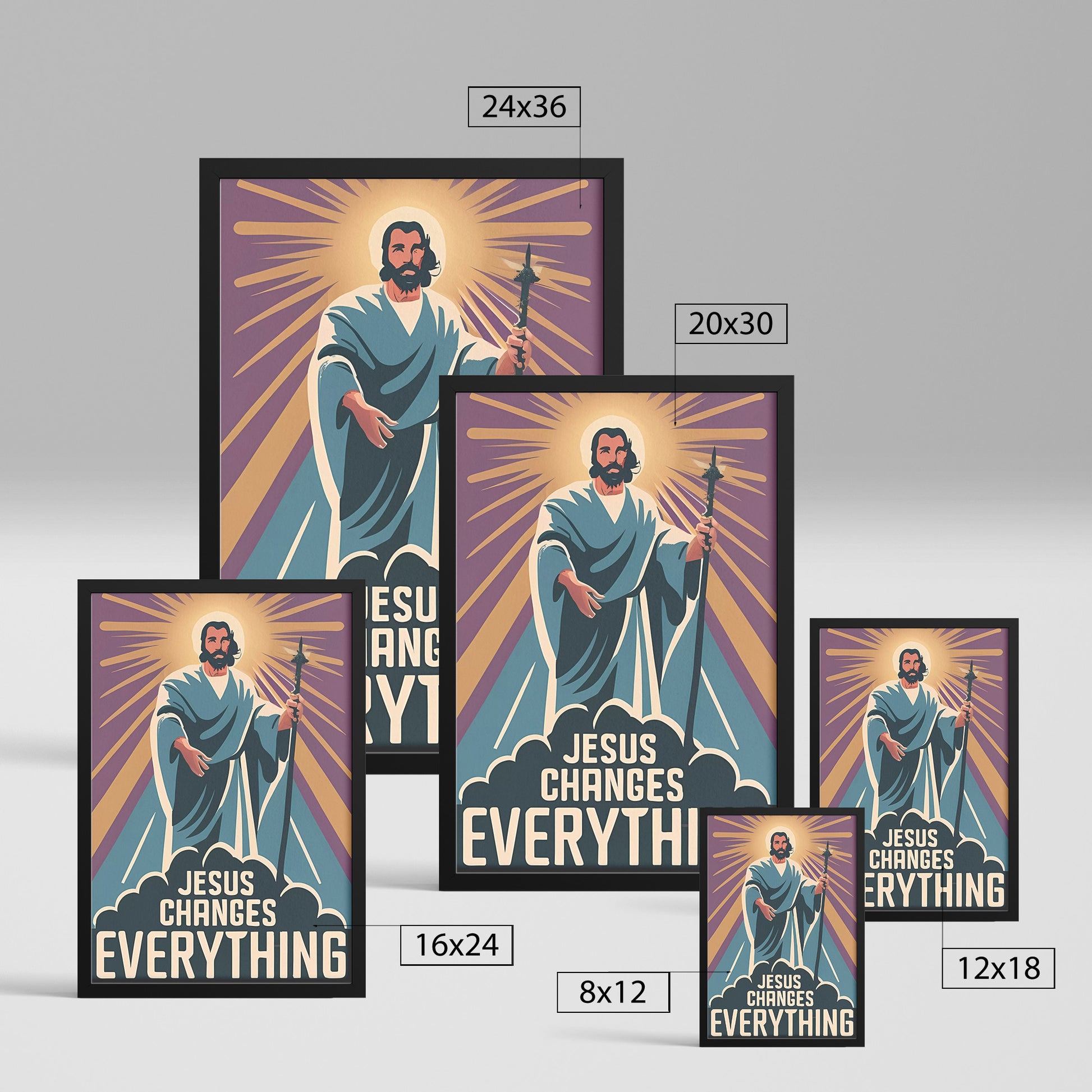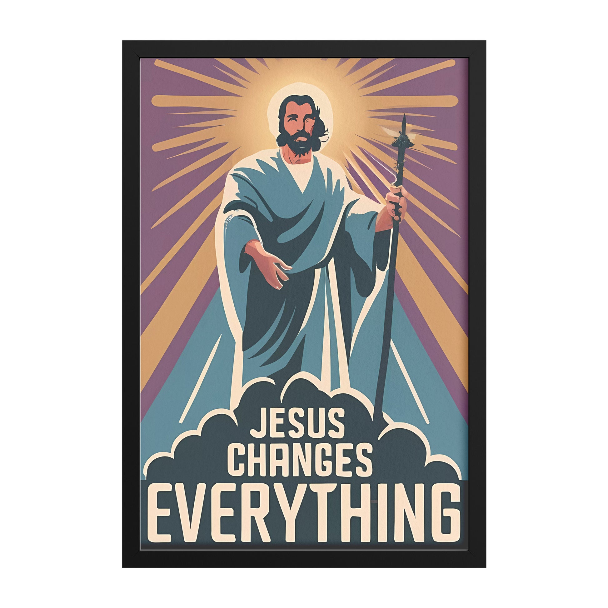 Prepare to be transformed by the profound message of divine illumination, unwavering hope, and unwavering faith with our "Jesus Changes Everything Retro Style Framed Poster." This captivating artwork isn't just a visual delight; it's a reminder that the presence of Jesus brings light to even the darkest corners of our lives, echoing the profound truth: "Jesus changes everything."
