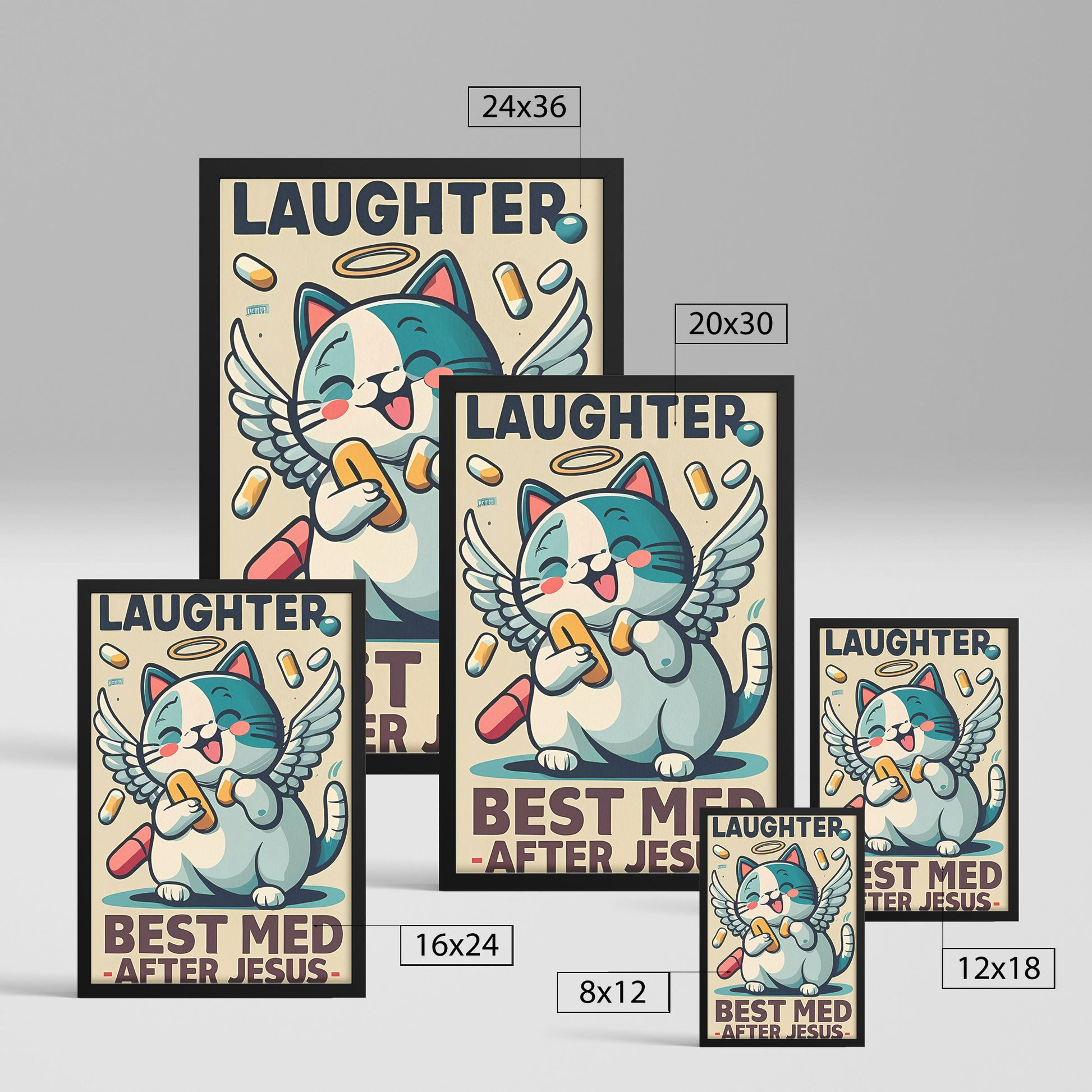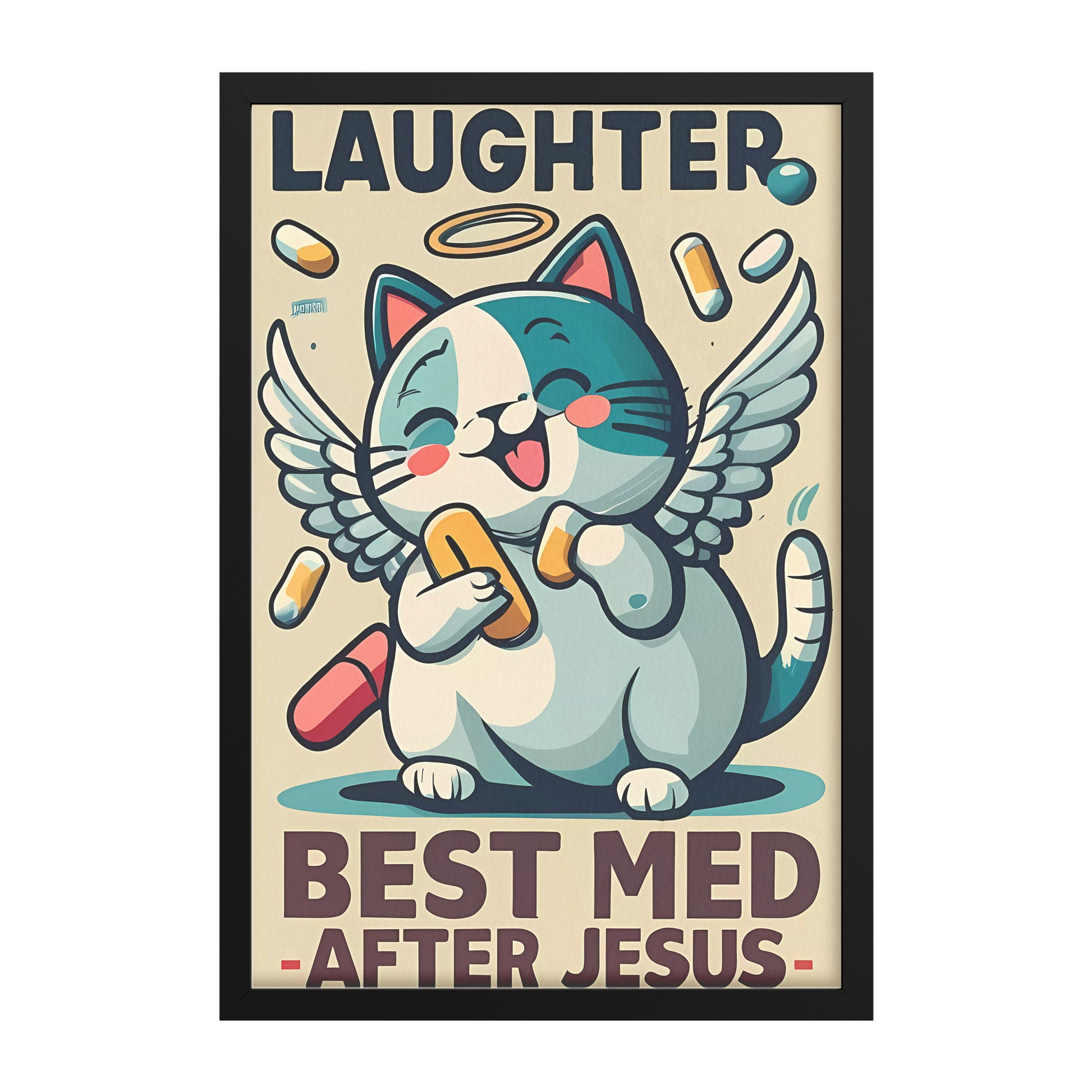 This framed poster exudes the charm of a bygone era while infusing a dose of adorable with a kawaii-style angel cat holding a medicine pill. The message, "Laughter, Best Med After Jesus," is playfully and lovingly displayed, reminding you that in the journey of faith, laughter and joy are precious remedies.