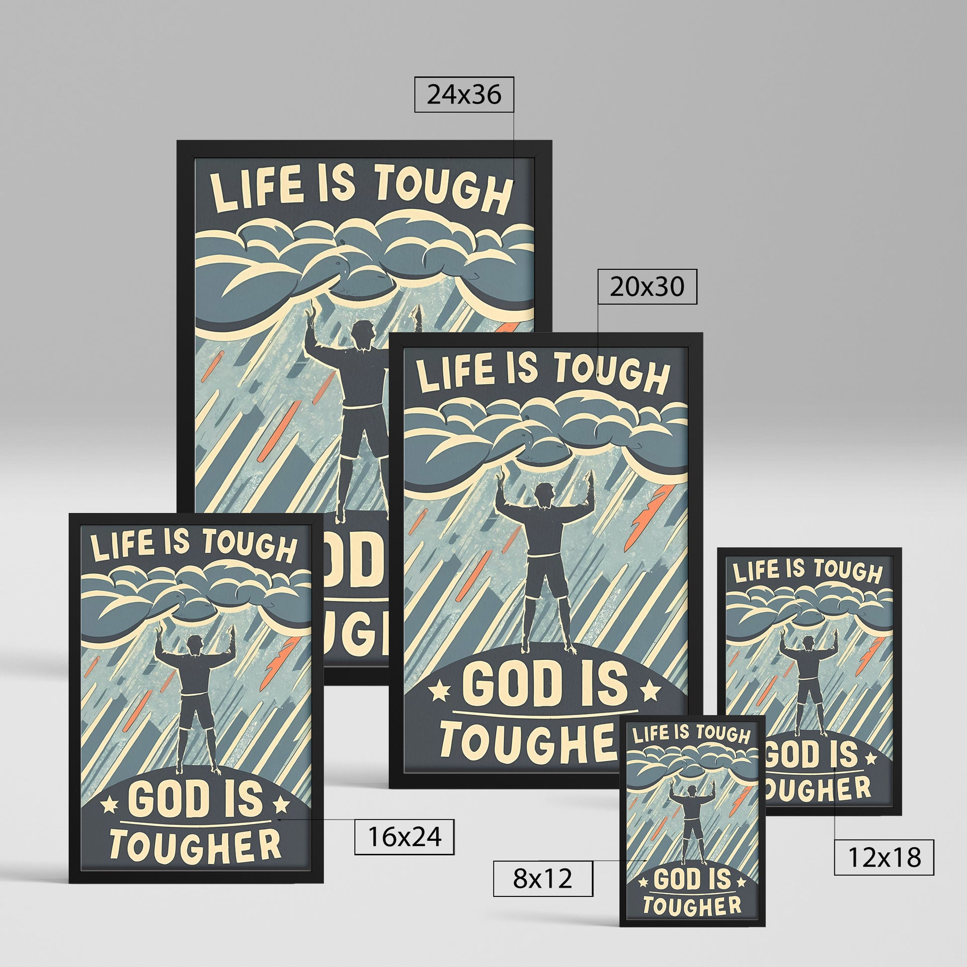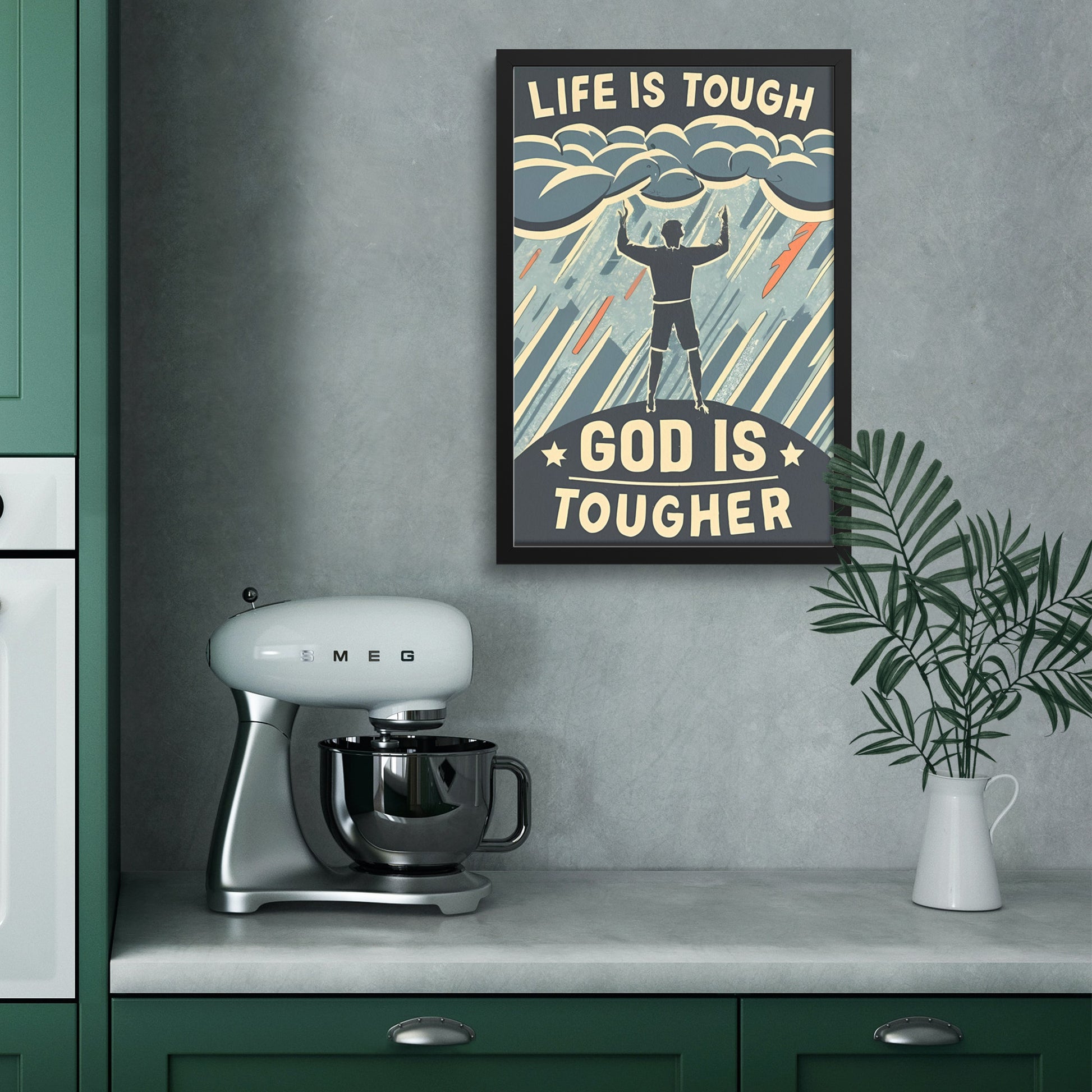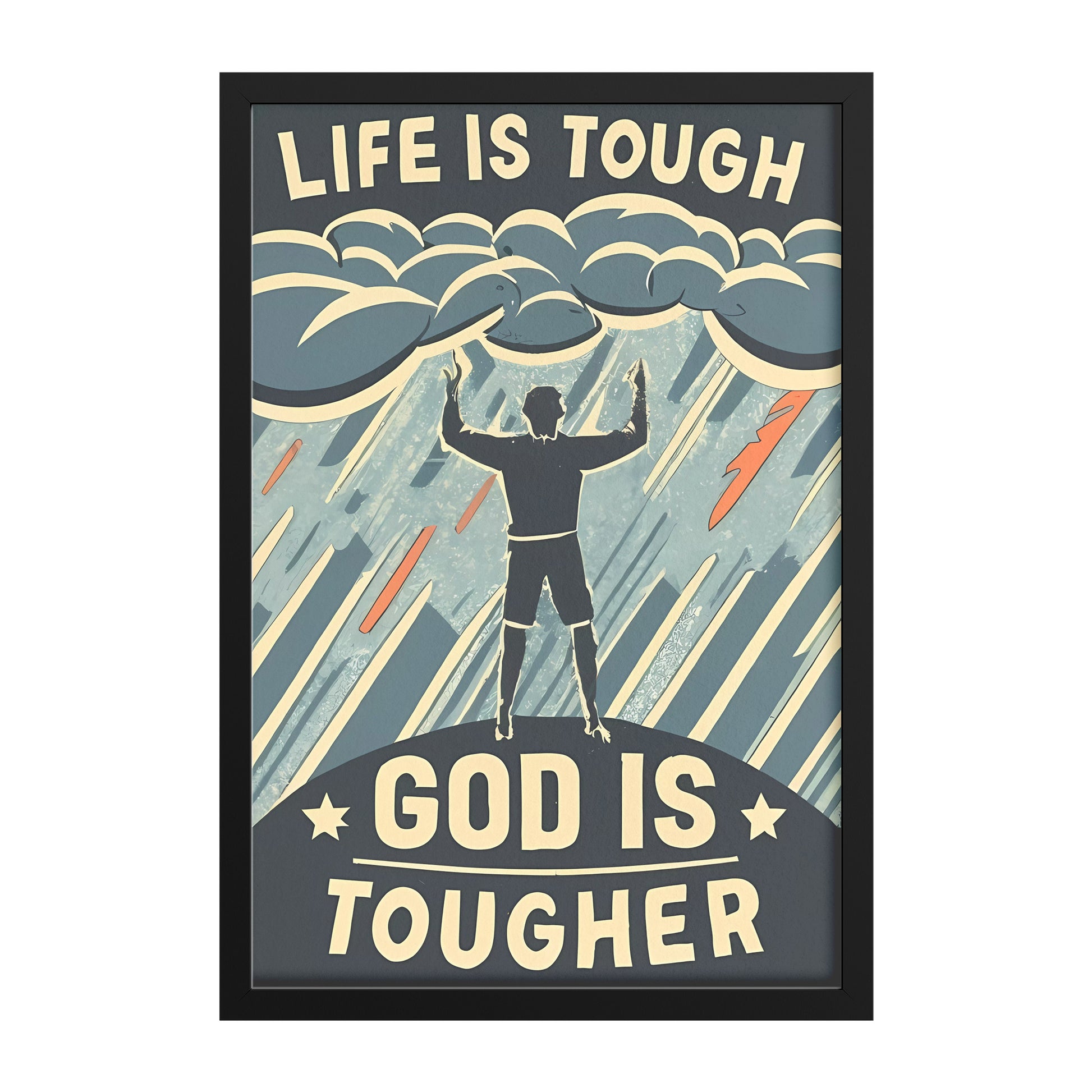 This framed poster is a timeless piece that captures the essence of retro charm while delivering a message of indomitable spirit. At its heart, a resilient figure stands strong amidst a tempest, a symbol of unwavering faith and resilience. The words, "Life is Tough, But God is Tougher," are boldly scripted, inviting you to draw strength from the One who never falters.