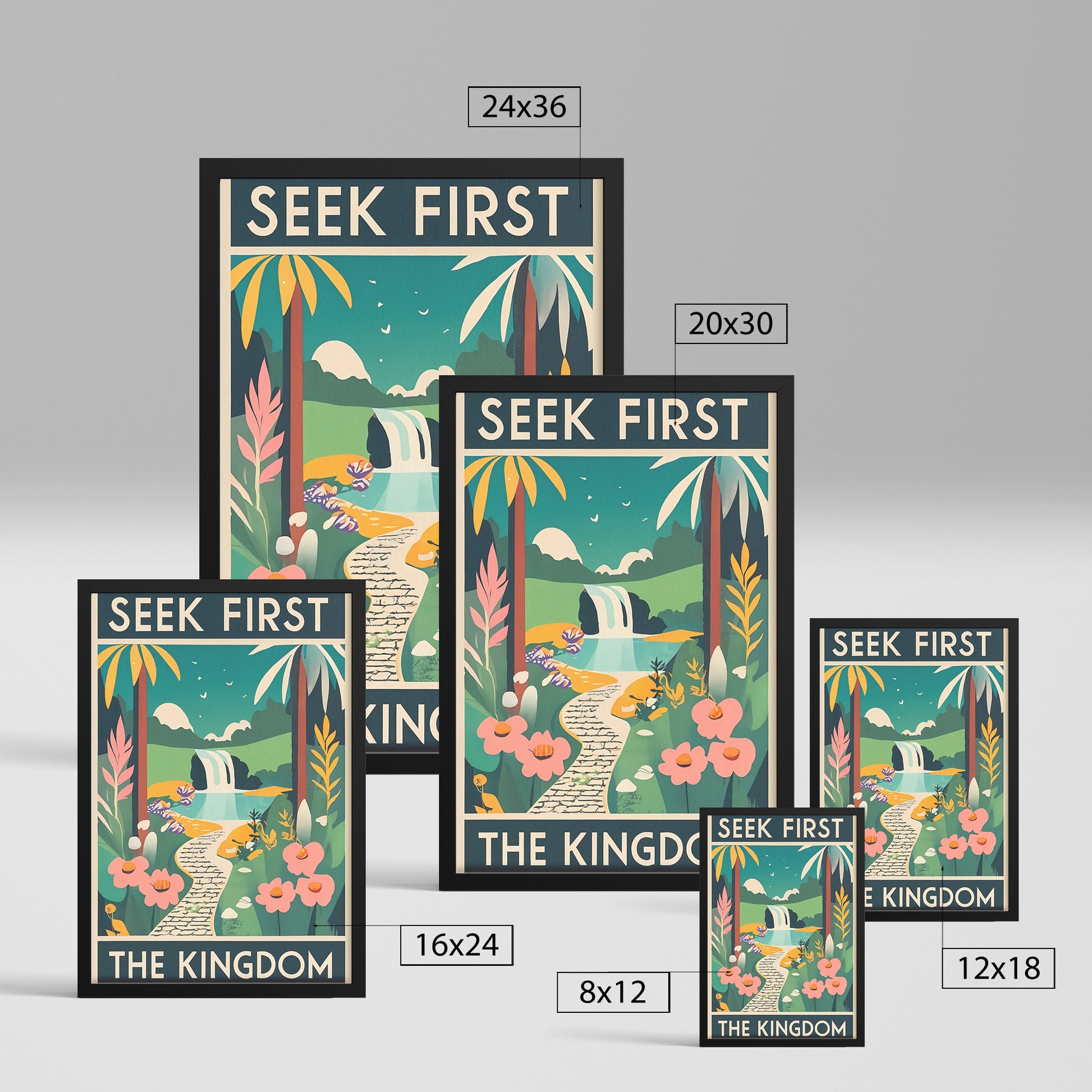 Enter a world of unwavering devotion and spiritual focus with our "Seek First the Kingdom Retro Style Framed Print." This captivating artwork not only graces your wall with vintage charm but also serves as a daily reminder of the profound wisdom found in Matthew 6:33: "But seek first the kingdom of God and his righteousness, and all these things will be added to you."