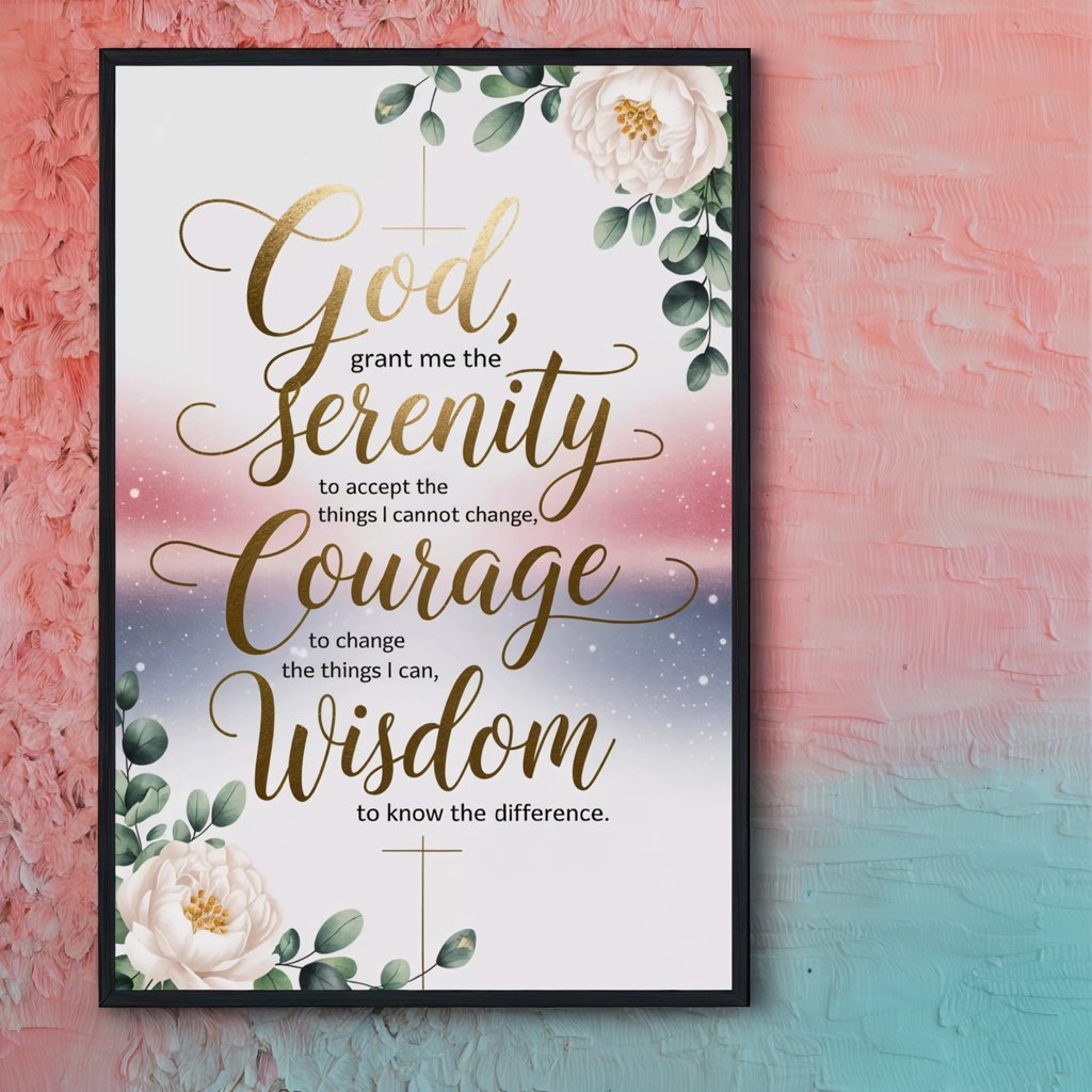 The Serenity Prayer isn't just beautiful words - it's a daily conversation with God that changes everything. I designed this piece during my own journey of learning to let go and trust God's timing. The way the gold catches the light reminds me that His presence shines brightest in our moments of surrender. I kept the style soft and elegant, with blush pinks and gentle grays that bring a sense of calm to any room. Each word was carefully placed so you can really sit with its meaning - whether you're sipping your morning coffee or ending your day in prayer. Perfect for your bedroom, prayer corner, or anywhere you need that gentle reminder that God's got this. It's printed on luxury paper with shimmering details that make it feel as special as the prayer itself.