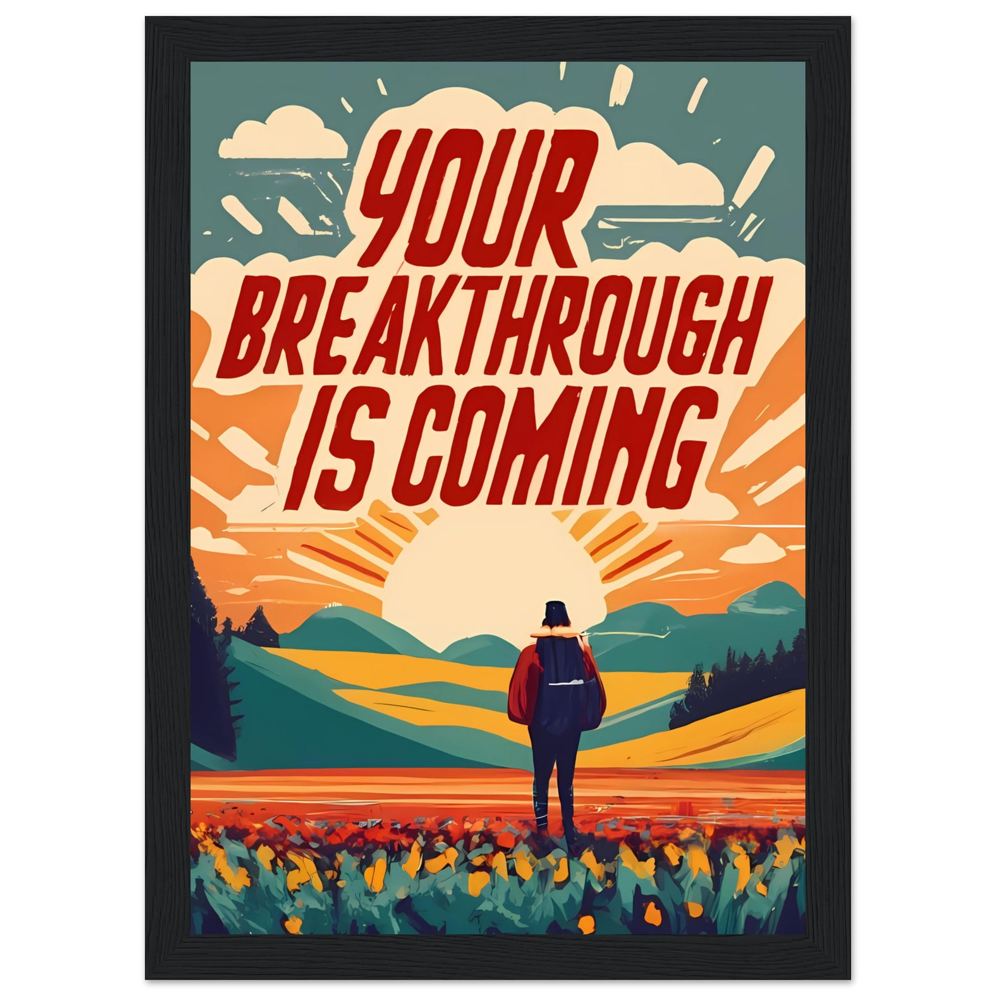 This framed poster features a retro-inspired design that exudes nostalgia and inspiration. The encouraging words "Your Breakthrough is Coming" are elegantly displayed in a classic font against a backdrop of a breathtaking sunrise, painting the sky with hues of hope and promise.
