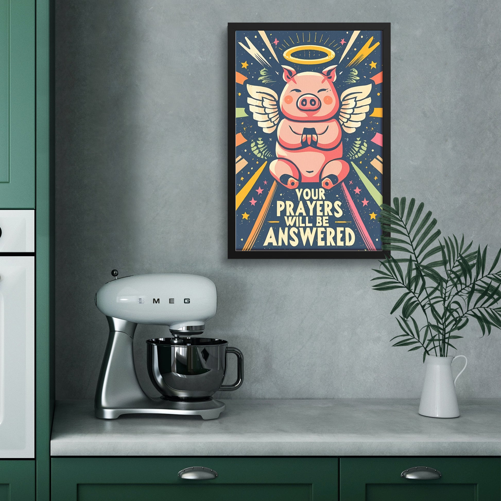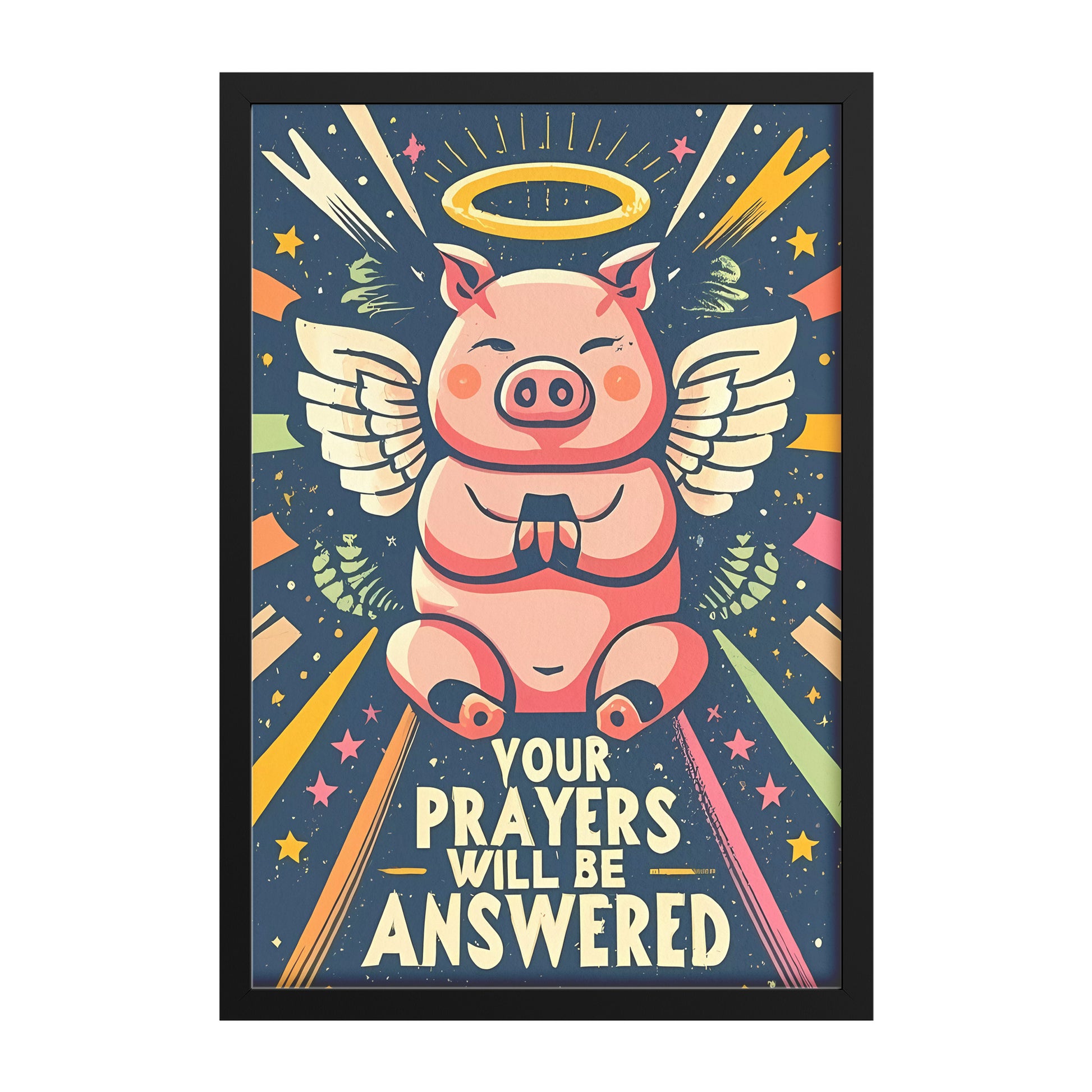 This framed poster is a delightful fusion of adorable and divine, with a kawaii-style angel pig lifting its little hands in prayer, encircled by radiant beams of light. The reassuring words, "Your Prayers Will Be Answered," are gracefully displayed, inviting you to bask in the assurance of divine response.