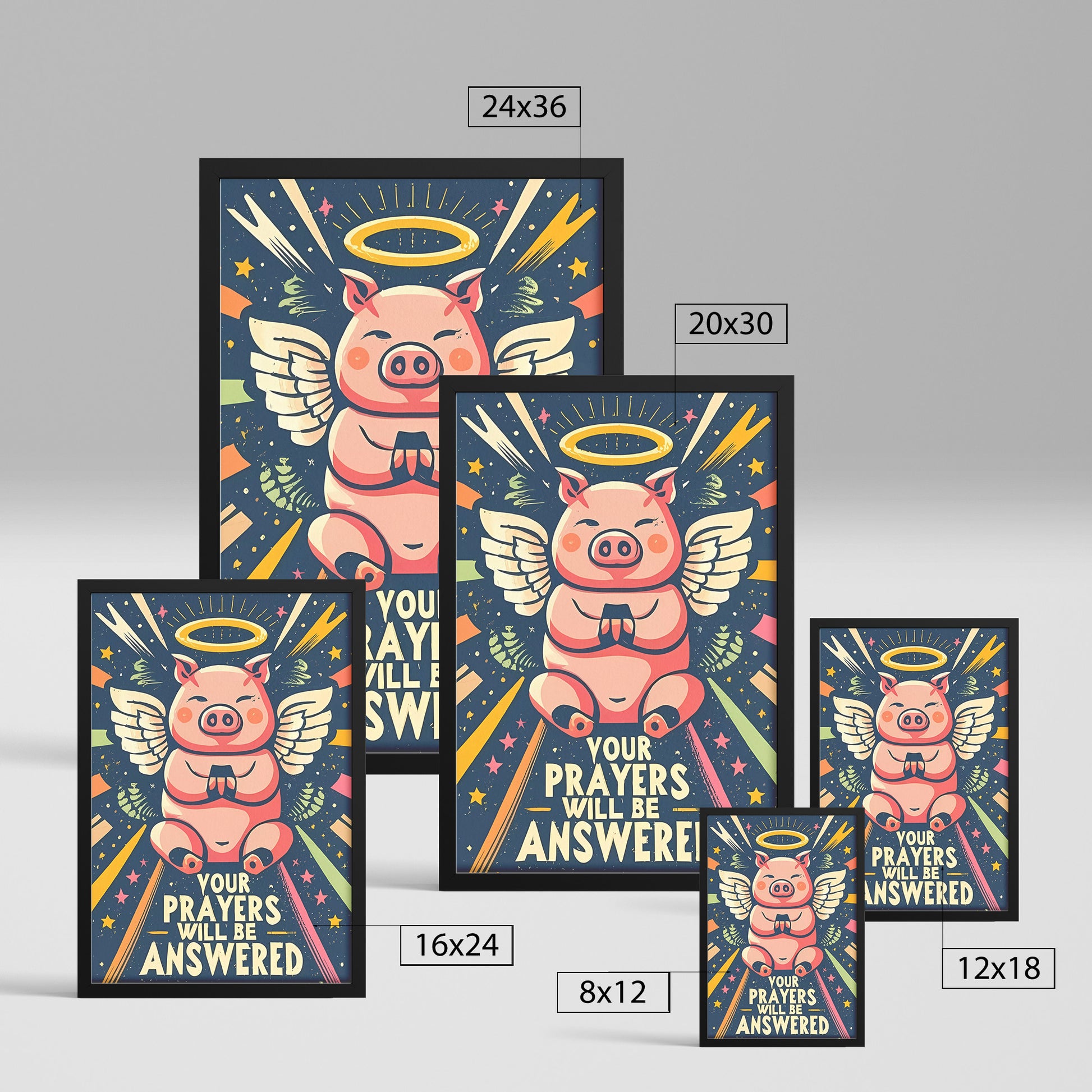 Step into a world of boundless hope, heavenly intervention, and unwavering faith with our "Your Prayers Will Be Answered Kawaii Angel Pig Framed Poster." This heartwarming artwork doesn't just decorate your wall; it embodies the promise of answered prayers, echoing the profound truth that your heartfelt supplications are heard.